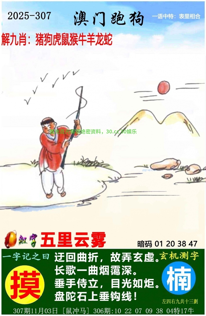 307期:绿草五湖水土旺,犬护后院猪安定。开:狗20